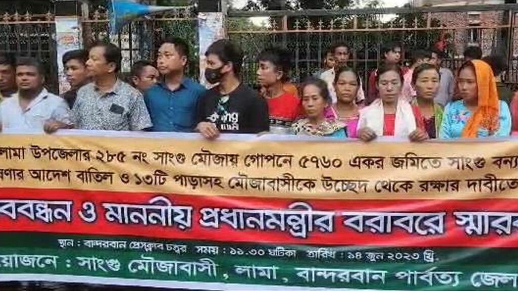 বুধবার (১৪ জুন) সকালে বান্দরবান প্রেসক্লাব চত্ত্বরে সামনে এই মানববন্ধন অনুষ্ঠিত হয়। এসময় বিভিন্ন প্লে কার্ড ও ফেস্টুন হাতে নিয়ে ১৩টি পাড়া সাঙ্গু মৌজাবাসী এই মানববন্ধনে অংশ নেন।