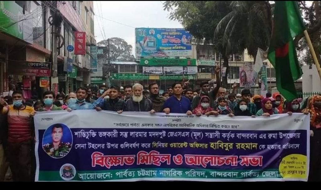 “সর্বক্ষেত্র পার্বত্য এলাকার সকল নাগরিকের সাংবিধানিক অধিকার নিশ্চিত করতে হবে” এই প্রতিপাদ্যকে সামনে রেখে শান্তিচুক্তি ভঙ্গকারী জেএসএস কর্তৃক বান্দরবান রুমা উপজেলার সেনা টহলে গুলি বর্ষণ করে সিনিয়র ওয়ারেন্ট অফিসার হাবিবুর রহমান হত্যার প্রতিবাদে বিক্ষোভ মিছিল ও আলোচনা সভা করেছে বান্দরবান পার্বত্য চট্টগ্রাম নাগরিক পরিষদ।