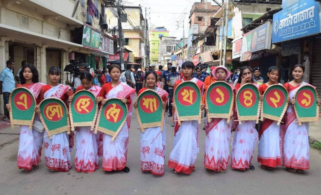 পরে একটি বর্ণাঢ্য মঙ্গল শোভাযাত্রা জেলা প্রশাসকের কার্যালয় (জেলা কালেক্টরেট ভবন) চত্বর হতে বের হয়ে শহরের প্রধান প্রধান সড়ক প্রদক্ষিণ শেষে রাজার মাঠে গিয়ে শোভাযাত্রা শেষ হয়। শোভাযাত্রায় বাঙালিদের পাশাপাশি ১১টি ক্ষুদ্র নৃগোষ্ঠির তরুণ-তরুণী, নর-নারীরা নিজস্ব পোশাক ও গ্রামীণ সংস্কৃতি এবং ঐতিহ্যবাহী সামগ্রী প্রদশর্নী করে এতে অংশগ্রহণ করে।
