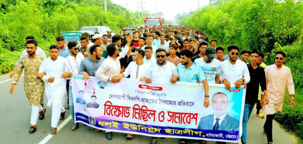 চট্টগ্রামের হাটহাজারীতে বিএনপি-জামায়াতের নৈরাজ্যের বিরুদ্ধে বিক্ষোভ মিছিল ও সমাবেশ করেছে ধলই ইউনিয়ন ছাত্রলীগ।
