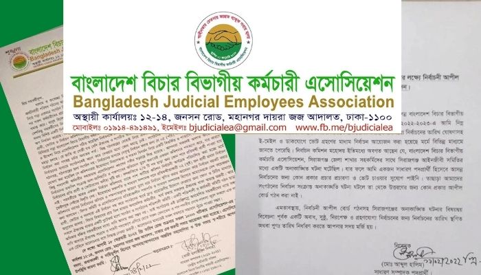 বাংলাদেশ বিচার বিভাগীয় কর্মচারী এসোসিয়েশন নির্বাচনে ‘বিতর্কিত ও পাতানো নির্বাচনের মাধ্যমে কিছু পদলোভী কর্মচারীদের নির্বাচিত করার পয়তারা করছে’— অভিযোগ এনে নির্বাচন স্থগিত চেয়ে আবেদন করেছেন নির্বাচনে প্রতিদ্বন্দ্বিতাকারী সাধারণ সম্পাদকের মতো প্রধান দুই প্রার্থী।