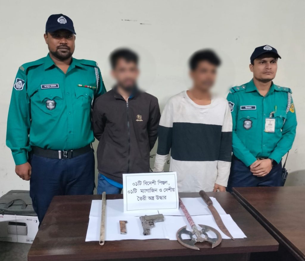 এ সময় তাদের কাছ থেকে যুক্তরাষ্ট্রের তৈরি একটি বিদেশি পিস্তল, একটি ম্যাগাজিন, একটি চাইনিজ কুড়াল, একটি ধারালো ছুরি ও একটি লোহার রড উদ্ধার করে।