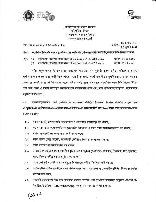 মন্ত্রিপরিষদ বিভাগের প্রজ্ঞাপনে বলা হয়েছে, পবিত্র ঈদুল আযহা উদ্‌যাপন, জনসাধারণের যাতায়াত, ঈদ পূর্ববর্তী ব্যবসা-বাণিজ্য পরিচালনা, দেশের আর্থ-সামাজিক অবস্থা এবং অর্থনৈতিক কার্যক্রম স্বাভাবিক রাখার স্বার্থে আগামী ১৪ জুলাই ২০২১ তারিখ মধ্যরাত থেকে ২৩ জুলাই সকাল ০৬টা পর্যন্ত আরোপিত সকল বিধিনিষেধ শিথিল করা হলো। তবে এ সময়ে সর্বাবস্থায় জনসাধারণকে সতর্কাবস্থায় থাকা এবং মাস্ক পরিধানসহ স্বাস্থ্যবিধি কঠোরভাবে অনুসরণ করতে হবে।