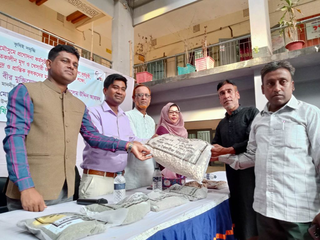 এসময় রবি মৌসুমে আবাদ বৃদ্ধির লক্ষ্যে পৌরসভাসহ উপজেলার ৯টি ইউনিয়নের ৪২১ জন প্রান্তিক কৃষকদের মাঝে পৃথকভাবে ২ কজি ভুট্টা, ১ কেজি সরিষা, ১ কজি সূর্যমুখী, ১০ কেজি চীনা বাদাম, শীতকালীন মুগ ৫ কেজি ও ৮ কেজি খেসারি বীজ এবং ১০কেজি ডিএপি ও ১০ কেজি এমওপি সার বিতরণ করা হয়।