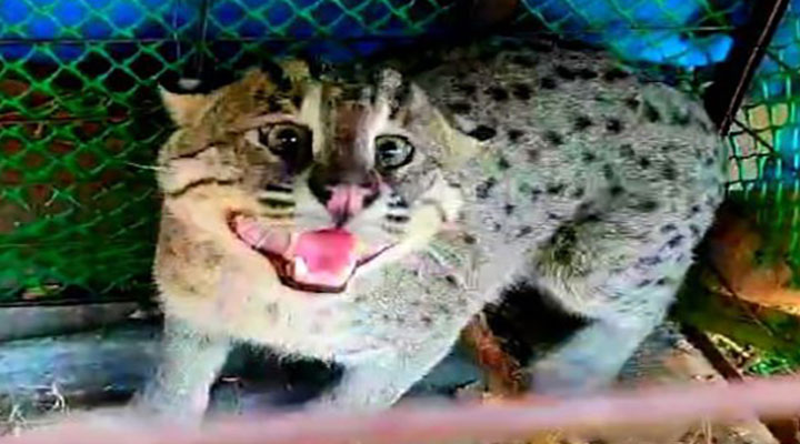 খাদ্যের সন্ধানে লোকালয়ে এসে একটি বিপন্ন প্রজাতির মেছোবাঘ (মেছো বিড়াল) ফাঁদে আটকা পড়লে তা উদ্ধার করে হাটহাজারী উপজেলা বন বিভাগের একটি টিম।