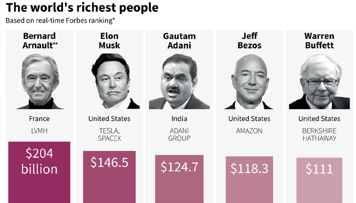 এবারের এই তালিকায় প্রথমেই রয়েছেন বার্নার্ড আর্নল্ট। ফ্রান্সের এই ধনকুবেরের মোট সম্পদ ২০৪ বিলিয়ন ডলারের। আর্নল্ট হল বিলাস দ্রব্য এলভিএমএইচ-এর সিইও। যারা লুই ভিটন, ক্রিশ্চিয়ান ডিওর এবং গিভেঞ্চির মতো ব্র্যান্ডের মালিক।