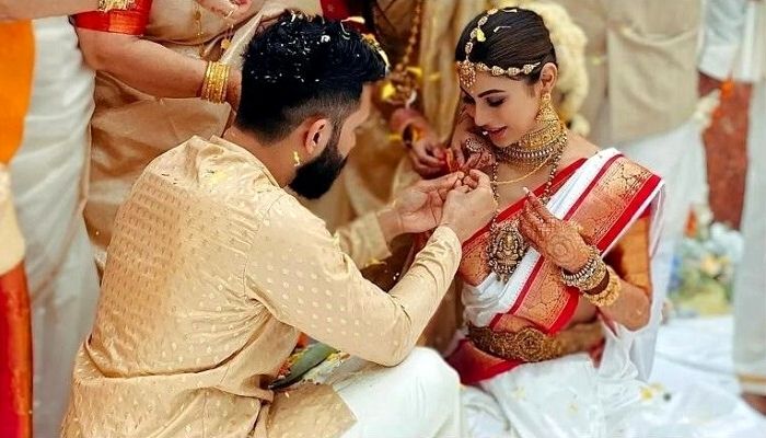 প্রেমিক সূর্য নাম্বিয়ার সঙ্গে বিবাহ বন্ধনে আবদ্ধ হলেন বলিউডের বাঙালি অভিনেত্রী মৌনি রায়। বৃহস্পতিবার (২৭ জানুয়ারি) গাঁটছড়া বাঁধেন তারা।
