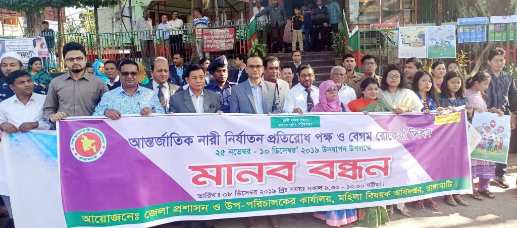 আন্তর্জাতিক নারী নির্যাতন প্রতিরোধ পক্ষ ও বেগম রোকেয়া দিবস উপলক্ষ্যে রাঙামাটি শহরে মানববন্ধন ও আলোচনা সভা অনুষ্ঠিত হয়েছে। দিবসটি পালনে রাঙামাটি শহরে ঘন্টাব্যাপী আয়োজিত মানববন্ধনের নেতৃত্ব দেন রাঙামাটির জেলা প্রশাসক একেএম মামুনুর রশিদ।