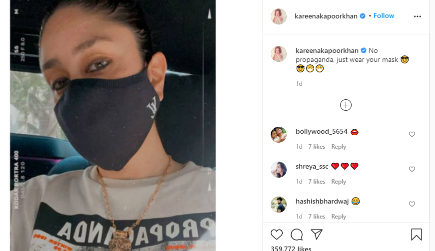 ভারতের বিনোদনভিত্তিক সংবাদমাধ্যম বলিউড বাবলের খবর, সামাজিক পাতায় সম্প্রতি কারিনা কাপুর খান কোভিড-সচেতনতামূলক একটি পোস্ট দিয়েছেন। সেখানে তাঁকে লুইস ভুটন ব্র্যান্ডের মাস্ক পরিহিত দেখা যায়। আর মাস্কটির দাম শুনলে আপনি চমকে উঠবেন।