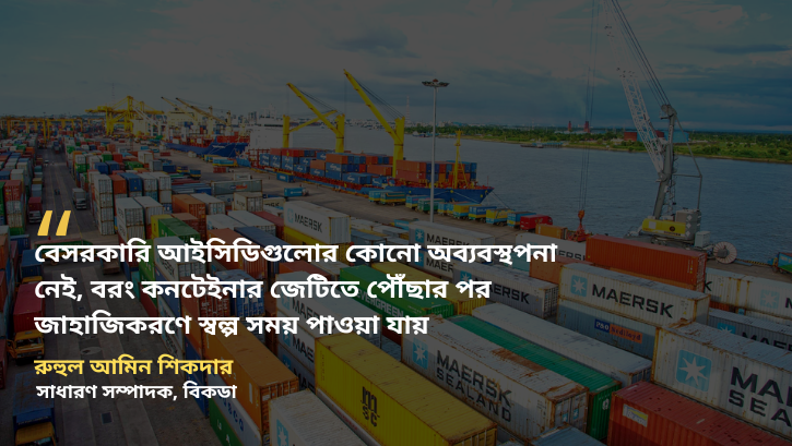 অন্যদিকে বেসরকারি আইসিডিগুলোর কোনো অব্যবস্থপনা নেই বলে জানান বাংলাদেশ ইনল্যান্ড কন্টেইনার ডিপোটস অ্যাসোসিয়েশনের (বিকডা) সাধারণ সম্পাদক রুহুল আমিন শিকদার। তিনি বাংলাধারাকে বলেন, নির্দিষ্ট সময়ে আইসিডিগুলো থেকে কনটেইনার বন্দর জেটিতে পৌঁছায়। তবে স্বল্প সময় পাওয়ার কারণে তা জাহাজে লোড করা সম্ভব হয় না।