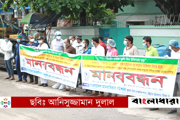 বাংলাদেশ মানবাধিকার কমিশনের সিনিয়র ডেপুটি গভর্নর আমিনুল হক বাবু বলেন, করোনা পরিস্থিতি চট্টগ্রামে মারাত্মক অবস্থায় পৌঁছেছে। এ অবস্থায় চিকিৎসা এবং করোনা টেস্টে চরম ভোগান্তিতে পড়েছে মানুষ। সরকারের পাশাপাশি বেসরকারী হাসপাতাল, ক্লিনিকগুলোকেও করোনা রুগীর চিকিৎসা দিতে হবে, চিকিৎসা না দিয়ে কাউকে ফেরত দেওয়া যাবে না। বিনা চিকিৎসায় আরেকটিও মৃত্যু যেন না হয় এই দাবীতেই আমাদের আজকের এই মানববন্ধন কর্মসূচি।
