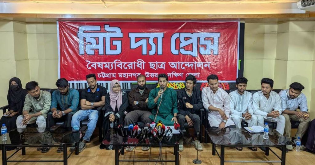 এছাড়াও, বৈষম্যবিরোধী ছাত্র আন্দোলন চট্টগ্রামে ইতোমধ্যে মহানগর, উত্তর জেলা ও দক্ষিণ জেলা কমিটি ঘোষণা করেছে এবং তরুণদের রাষ্ট্রীয় নীতিনির্ধারণী পর্যায়ে অন্তর্ভুক্তির জন্য আন্দোলন অব্যাহত রাখার কথা জানান।
