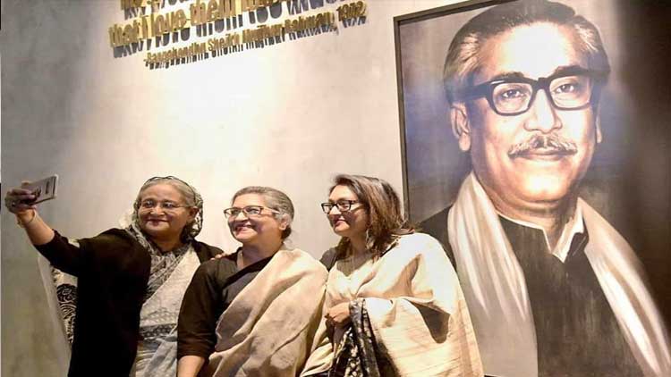 জাতির পিতা বঙ্গবন্ধু শেখ মুজিবুর রহমানের জন্মশতবার্ষিকী উপলক্ষে সাজানো জাতির পিতার প্রতিকৃতির সামনে দাঁড়িয়ে ছোট বোন শেখ রেহানা, কন্যা সায়মা ওয়াজেদ হোসেন পুতুলকে সঙ্গে নিয়ে সেলফি তুলছেন বঙ্গবন্ধুকন্যা মমতাময়ী প্রধানমন্ত্রী শেখ হাসিনা। ‘