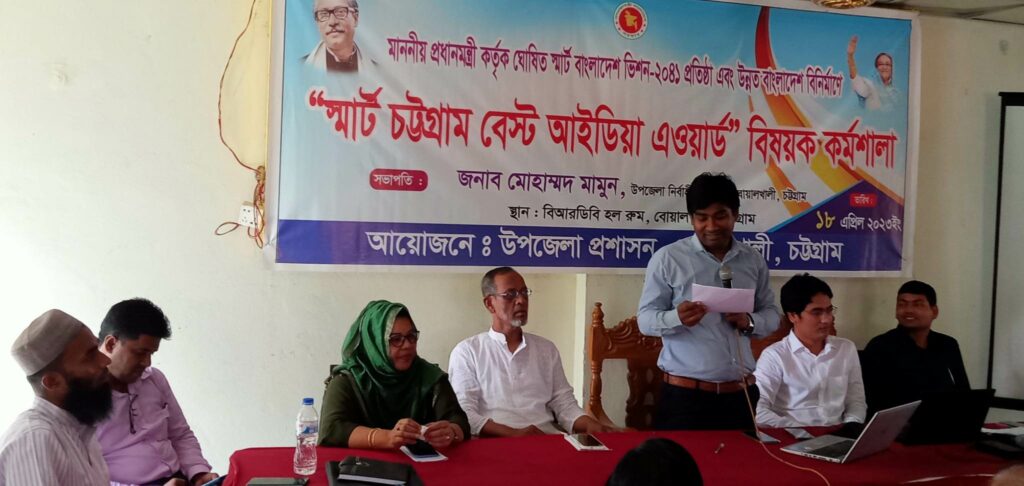 প্রধানমন্ত্রী ঘোষিত ডিস্ট্রিক্ট ইনোভেশন চ্যালেঞ্জ ২০২৩ এর আওতায় ২০৪১ সালে স্মার্ট বাংলাদেশ প্রতিষ্ঠা এবং উন্নত দেশ বিনির্মাণের লক্ষ্যে চট্টগ্রামের বোয়ালখালীতে ‘স্মার্ট চট্টগ্রাম বেস্ট আইডিয়া অ্যাওয়ার্ড’ বিষয়ক কর্মশালা অনুষ্ঠিত হয়েছে।