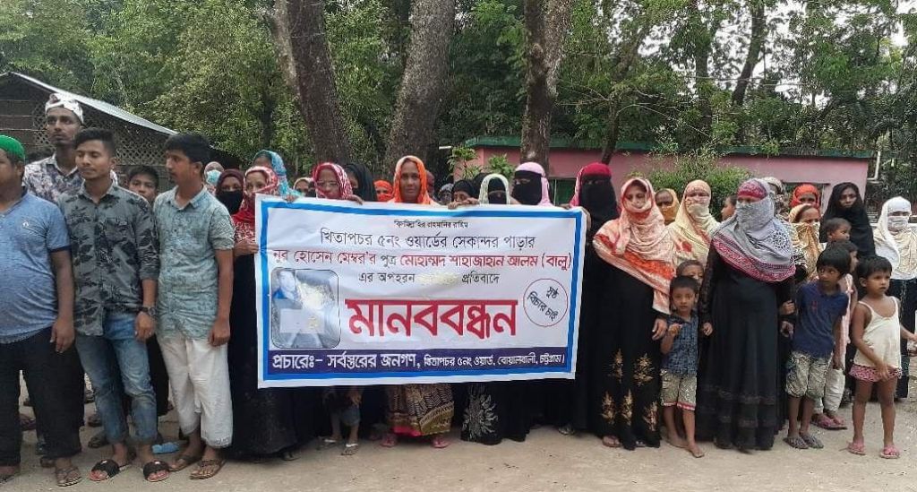 বুধবার (৭ অক্টোবর) বিকেলে উপজেলার খিতাপচর গ্রামে এ মানববন্ধনে অংশ নেন শত শত নারী-পুরুষ। তারা শাহাজানকে উদ্ধারের জন্য প্রশাসনের কাছে দাবি জানান।