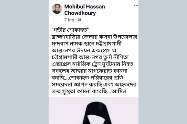 ব্রাহ্মণবাড়িয়া জেলার কসবা উপজেলার মন্দবাগ নামক স্থানে চট্টগ্রামগামী আন্তঃনগর উদয়ন এক্সপ্রেস ও চট্টগ্রামগামী আন্তঃনগর তুর্না নীশিতা এক্সপ্রেস মর্মান্তিক ট্রেন দুর্ঘটনায় নিহত সকলের আত্মার মাগফেরাত কামনা করছি…শোকাহত পরিবারের প্রতি সমবেদনা জ্ঞাপন করছি এবং আহতদের দ্রুত সুস্থতা কামনা করেছি…আমিন”