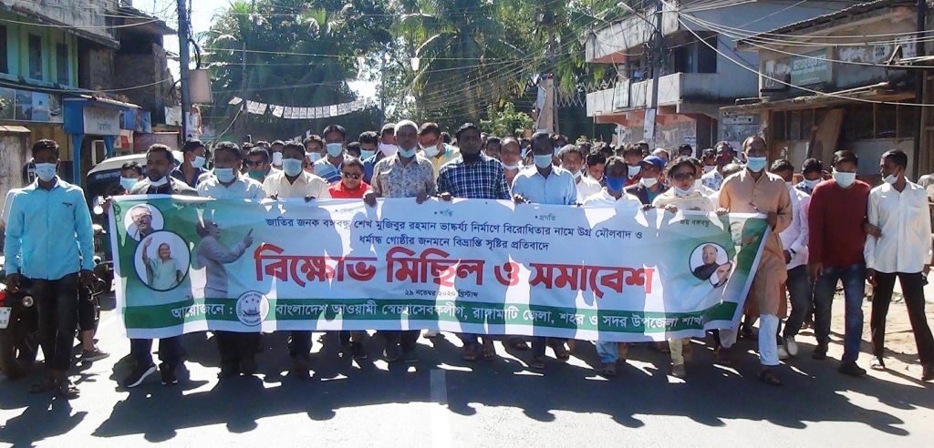 জাতির জনক বঙ্গবন্ধু শেখ মুজিবুর রহমান এর ভাষ্কর্য নির্মাণে বিরোধিতার প্রতিবাদে পার্বত্য রাঙামাটি শহরে বিক্ষোভ মিছিল ও সমাবেশ করেছে রাঙামাটি জেলা আওয়ামী স্বেচ্ছাসেবকলীগ।