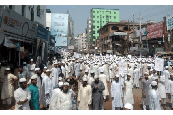 পুলিশ জানায়, বিক্ষোভে তারা ইন্টারন্যাশনাল সোসাইটি ফর কৃষ্ণা কনসাসনেসের (ইসকন) কার্যক্রম বন্ধের দাবি তুলেছেন। এ ছাড়া ‘রসুল (স.)-এর জন্য উৎসর্গ করা রক্ত বৃথা যেতে দেব না’সহ বিভিন্ন স্লোগান দিচ্ছেন।