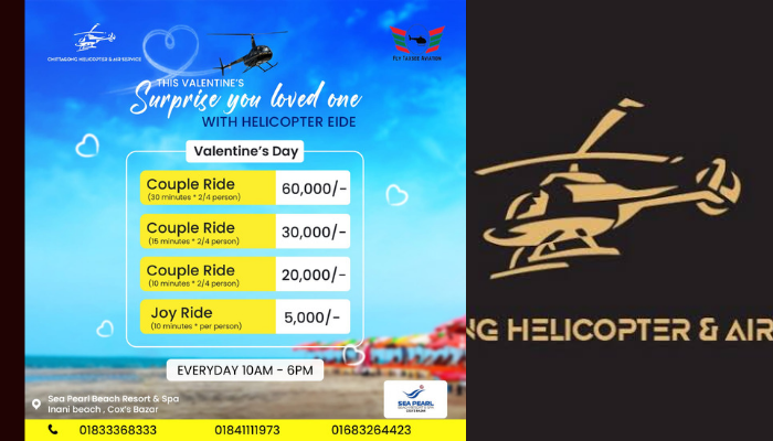 ভালোবাসা দিবসে প্রিয়জনসহ জীবনের সেরা রোমাঞ্চকর অভিজ্ঞতা উপভোগ করতে ‘চিটাগাং হেলিকপ্টার এন্ড এয়ার সার্ভিস’ বিশেষ প্যাকেজ ঘোষণা করেছে।