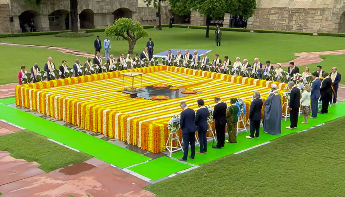 ভারতে অনুষ্ঠিত জি২০ শীর্ষ সম্মেলনের দ্বিতীয় দিনে মহাত্মা গান্ধীকে শ্রদ্ধা জানিয়েছেন প্রধানমন্ত্রী শেখ হাসিনাসহ বিশ্ব নেতারা। এর আগে এই কর্মসূচিকে কেন্দ্র করে সকালে দিল্লির রাজঘাটে উপস্থিত হন তাঁরা।