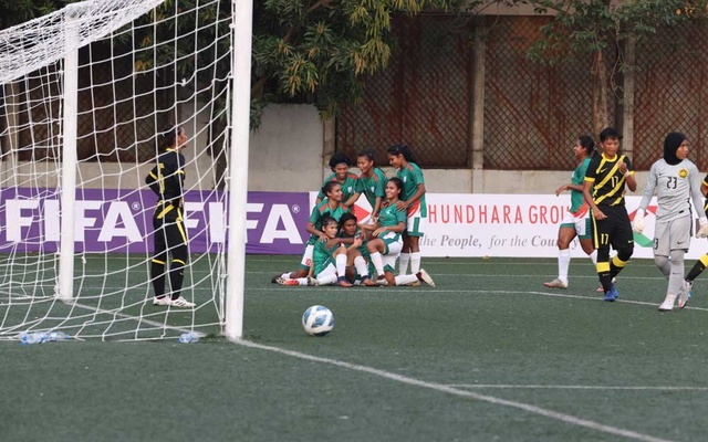 মালয়েশিয়ার রক্ষণে চাপ ধরে রেখে নবম মিনিটে গোল তুলে নেয় বাংলাদেশ। মারিয়া মান্দার কর্নারে গোলরক্ষক আজুরিন বিনতে মাজলান ক্লিয়ার করতে ব্যর্থ হলে গোলমুখ থেকে আলতো টোকায় বাকি কাজ সারেন আঁখি। বাংলাদেশের গোল উৎসবের সেই শুরু।