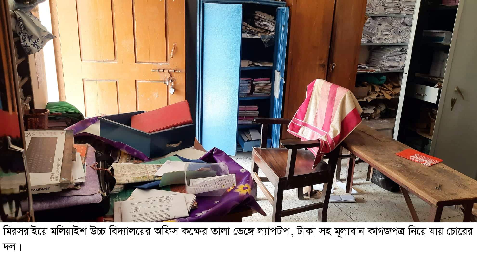 অন্যদিকে মলিয়াইশ উচ্চ বিদ্যালয়ের প্রধান শিক্ষক জসিম উদ্দিন বলেন, বৃহস্পতিবার রাত ২ টা থেকে সাড়ে ৩ টার মধ্যে চোরের দল মুখোশ পরে স্কুলের পশ্চিম পাশ্ব দিয়ে ভিতরে প্রবেশ করে। স্কুলের অফিস কক্ষের তালা ভেঙ্গে ৪ থেকে ৫ টি আলমিরার তালা ভেঙ্গে জিনিসপত্র এলোমেলো করে ফেলে রাখে। এসময় তারা নগদ ৬০ হাজার টাকা, একটি ল্যাপটপ কম্পিউটার, একটি হ্যান্ডসেট মোবাইলসহ গুরুত্বপূর্ণ জিনিসপত্র নিয়ে যায়।
