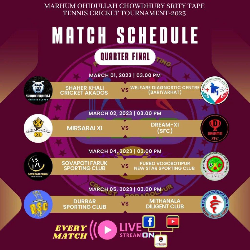জোরারগঞ্জের পরাগলপুর মাঠে প্রথম ম্যাচে সাহেরখালি ক্রিকেট একাদশ বনাম ওয়েলফেয়ার ডায়াগনস্টিক সেন্টারের খেলা অনুষ্ঠিত হবে বিকাল ৩ টায়।