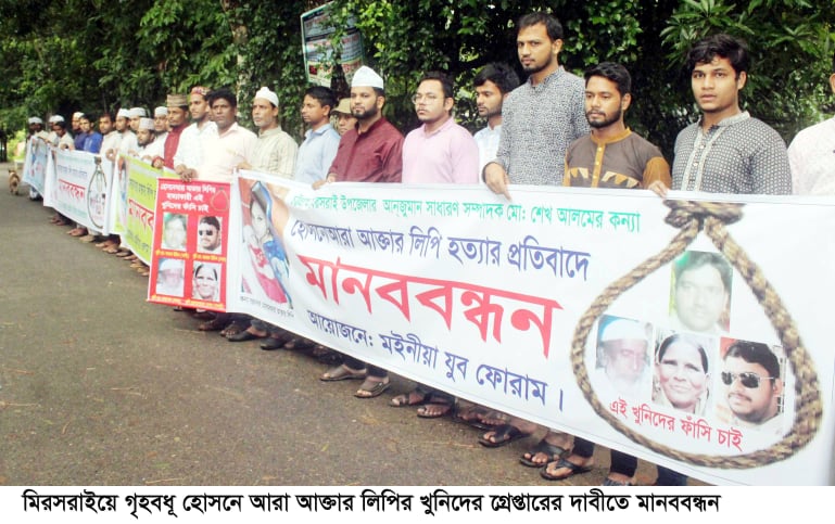 মিরসরাইয়ে গৃহবধূ লিপির হত্যাকারীদের গ্রেপ্তারের দাবীতে মানববন্ধন