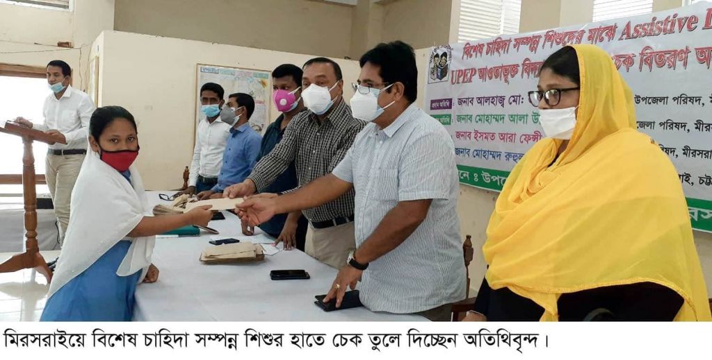 মিরসরাইয়ে বিশেষ চাহিদা সম্পন্ন শিশুদের মাঝে সহায়ক ডিভাইস ও ইউপিইপি আওতাভুক্ত বিদ্যালয়ের মাঝে চেক বিতরণ করা হয়েছে।