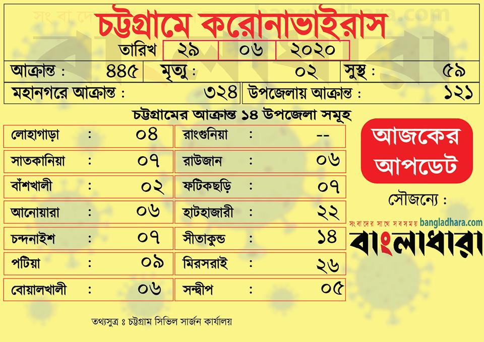 এছাড়া বাকি উপজেলা গুলোতে করোনা রোগীর সংখ্যা দুই থেকে আট অংকের ভিতর। তবে সবচেয়ে কমে করোনা রোগী সনাক্ত হয়েছে দক্ষিণ চট্টগ্রামের বাঁশখালীতে এবং আজকের দিনের ফলাফলে করোনশূন্য ছিলো উত্তর চট্টগ্রামের রাঙ্গুনিয়া।