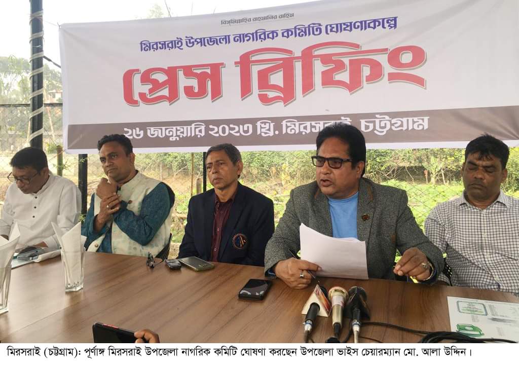 মিরসরাই উপজেলা নাগরিক কমিটির বিষয়ভিত্তিক কমিটির প্রধান ও মিরসরাই উপজেলা পরিষদের ভাইস চেয়ারম্যান মো. আলা উদ্দিন প্রেস বিফ্রিং এ জানান, মিরসরাইয়ের সংসদ সদস্য ইঞ্জিনিয়ার মোশাররফ হোসেনকে প্রধান উপদেষ্টা, আমরা মুক্তিযোদ্ধার সন্তান কেন্দ্রীয় কমিটির প্রেসিডিয়াম সদস্য মাহবুব রহমান রুহেল, মিরসরাই উপজেলা পরিষদের চেয়ারম্যান মো. জসিম উদ্দিনসহ মোট ৬১ বিশিষ্টজনকে নিয়ে উপদেষ্টা পরিষদ।