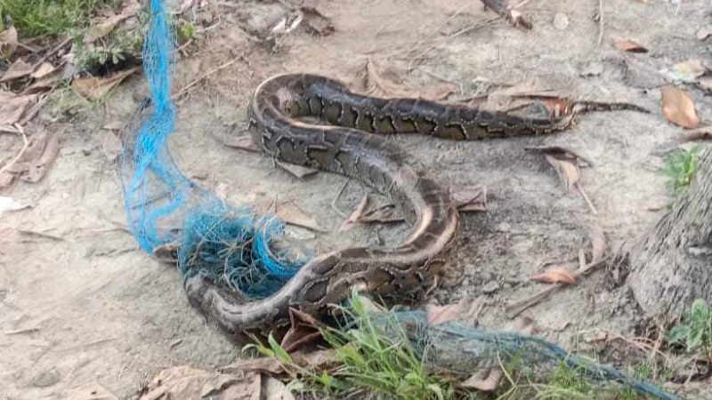 স্থানীয়রা জানান, বাবুল চৌধুরী নামের এক কৃষক তাঁর মৎস প্রকল্পের জন্য প্লাস্টিকের জাল দিয়ে বেড়া দিয়েছেন। আজ সকালে মৎস প্রকল্প দেখতে গেলে সেখানে থাকা জালে একটি অজগর সাপ দেখতে পান তিনি। পরে বন বিভাগকে খবর দিলে তার সাপটি উদ্ধার করে নিয়ে যায়।