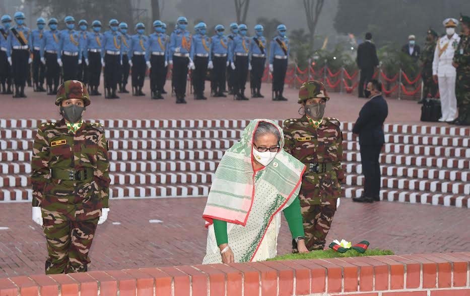 প্রধানমন্ত্রী শেখ হাসিনা ৫১তম বিজয় দিবস উপলক্ষে আজ সকালে রাজধানীর উপকণ্ঠে সাভার জাতীয় স্মৃতিসৌধে পুষ্পস্তবক অর্পণের মাধ্যমে মুক্তিযুদ্ধের বীর শহীদদের প্রতি গভীর শ্রদ্ধা নিবেদন করেছেন। পুষ্পস্তবক অর্পণের পর তিনি ১৯৭১ সালের মহান মুক্তিযুদ্ধের বীর শহীদদের স্মৃতির প্রতি গভীর শ্রদ্ধা জানিয়ে সেখানে কিছুক্ষণ নীরবে দাঁড়িয়ে থাকেন।