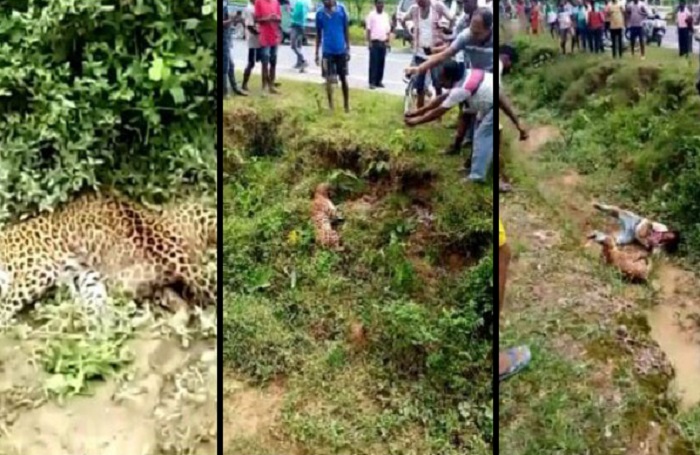 গুরুতর আহত অবস্থায় পড়ে থাকতে দেখে বাঘটিকে মৃত ভেবেছিলেন স্থানীয়রা। সামনে থেকে চিতাবাঘকে দেখে ছবি তোলার লোভ সামলাতে পারেনি তারা। তখনই ঘটে এই বিপত্তি।