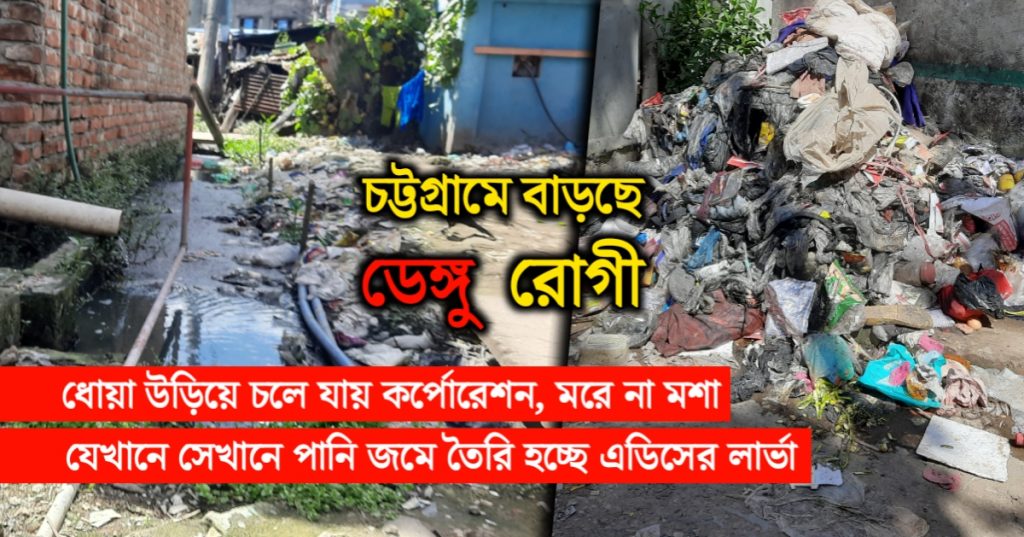যত্রতত্র জমছে ময়লা-আবর্জনার স্তূপ এবং পানি। রাস্তার পাশেই ছড়িয়ে ছিটিয়ে আছে ডাবের খোসা, প্লাস্টিকের বোতলসহ নানা রকমের পলিথিনের ব্যাগ। অল্প বৃষ্টিতেই সেখানে জমছে পানি, জন্ম নিচ্ছে এডিস মশা। শুধু সন্ধ্যা কিংবা রাত নয়, দিনের বেলাতেও মানুষ মশার জ্বালায় অতিষ্ঠ। সরেজমিনে নগরীর আগ্রাবাদ, হালিশহর, ইপিজেড ও পতেঙ্গা এলাকায় ঘুরে দেখা গেছে এমন সব চিত্র।