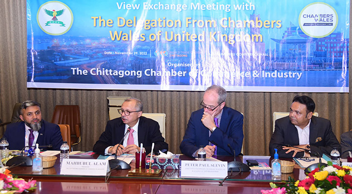 মতবিনিময় সভায় চেম্বার সভাপতি মাহবুবুল আলম বলেন, বাংলাদেশের গুরুত্বপূর্ণ বাণিজ্য অংশীদার হচ্ছে যুক্তরাজ্য। চলতি বছরে বাংলাদেশ থেকে প্রায় ৩.১ বিলিয়ন পাউন্ড যুক্তরাজ্যে রপ্তানি করা হয়েছে এবং যুক্তরাজ্য থেকে বাংলাদেশে ৯০১ মিলিয়ন পাউন্ড আমদানি করা হয়েছে। উভয় দেশের মধ্যে বিনিয়োগ এবং পণ্য আমদানি রপ্তানির দারুণ সুযোগ রয়েছে। সরকার দেশের অর্থনীতিকে বেগবান করতে ১০০টি বিশেষায়িত শিল্পাঞ্চল ঘোষণা করার ফলে চট্টগ্রাম দেশের ইন্ডাস্ট্রিয়াল হাবে পরিণত হয়েছে। তাই চট্টগ্রামের ভৌগোলিক সুবিধা কাজে লাগিয়ে যুক্তরাজ্যের চেম্বার ওয়েলস’র প্রতিনিধিদলকে বিনিয়োগ করার আহ্বান জানান চেম্বার সভাপতি।