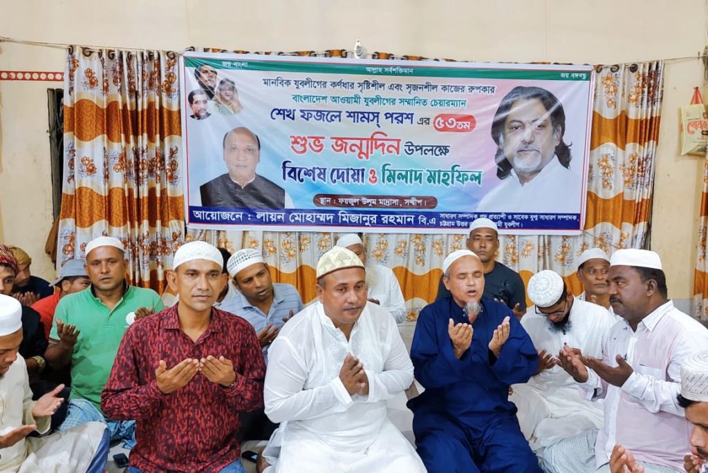 চট্টগ্রাম উত্তর জেলা আওয়ামী যুবলীগের সাবেক যুগ্ম সাধারণ সম্পাদক ও সন্দ্বীপ মাইটভাঙ্গা ইউনিয়নের নন্দিত চেয়ারম্যান লায়ন মো. মিজানুর রহমানের নির্দেশে অধ্যাপক শেখ ফজলে শামস পরশের সুস্বাস্থ্য ও দীর্ঘায়ু কামনা করে এবং তার মরহুম পিতা-মাতা ও ১৫ই আগস্টে স্ব-পরিবারে নিহত বঙ্গবন্ধু সহ পরিবারের সকল শহীদদের রুহের মাগফেরাত কামনা করে বিশেষ দোয়া ও মিলাদ মাহফিলের আয়োজন করা হয়।