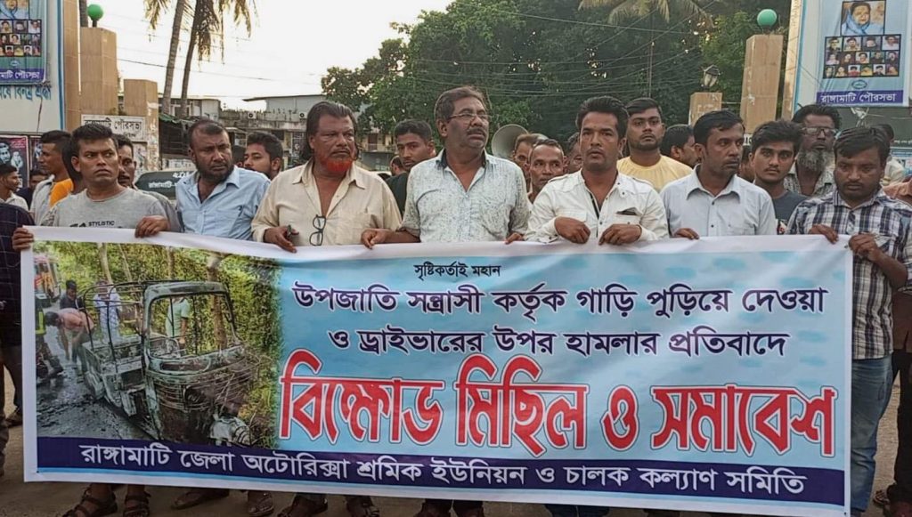 রাঙামাটিতে চাঁদা না পেয়ে আগুন লাগিয়ে অটোরিকশা পুড়িয়ে দেওয়ার ঘটনায় জড়িত পাহাড়ি সন্ত্রাসীদের গ্রেফতারসহ তিন দফা দাবি আদায়ে রাঙামাটি-চট্টগ্রাম মহাসড়ক ঘণ্টাব্যাপী অবরোধ করে শহরে বিক্ষোভ মিছিল সমাবেশ করেছে বিক্ষুব্ধ অটোরিকশা চালকরা।