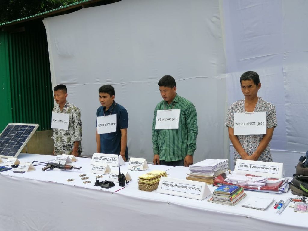 রাঙামাটির বরকলের উপজেলাধীন ছোট কাট্টলী এলাকার গভীর অরন্যে বিশেষ অভিযান চালিয়ে পার্বত্য চুক্তি বিরোধী সশস্ত্র সংগঠন ইউনাইটেড পিপলস ডেমোক্রেটিক ফ্রন্ট (ইউপিডিএফ) এর শীর্ষ চার সন্ত্রাসীকে অস্ত্রসহ আটক করেছে সেনাবাহিনী। শনিবার (৩১শে জুলাই) ভোররাতে রাঙামাটি সদর সেনাজোন কর্তৃক পরিচালিত এই বিশেষ অভিযানে ইউপিডিএফ এর সক্রিয় সন্ত্রাসী সুরেন চাকমা (৩৬), অন্নাসং চাকমা (৪৫), অনিল চাকমা (১৯) ও সাইমন চাকমা (৪০)কে একটি বিদেশী স্বয়ংক্রিয় একে-২২ রাইফেল, ৭৭ রাউন্ড তাজা গুলি, একটি ম্যাগজিন, ওয়াকিটকি, ভূয়া আইডি কার্ড, রাষ্ট্র বিরোধী শ্লোগান সম্বলিত ব্যানার, চাঁদাবাজি করে আদায় করা ৬৩ হাজার ৫৯২ টাকাসহ বিভিন্ন সরঞ্জাম উদ্ধার করা হয়েছে।