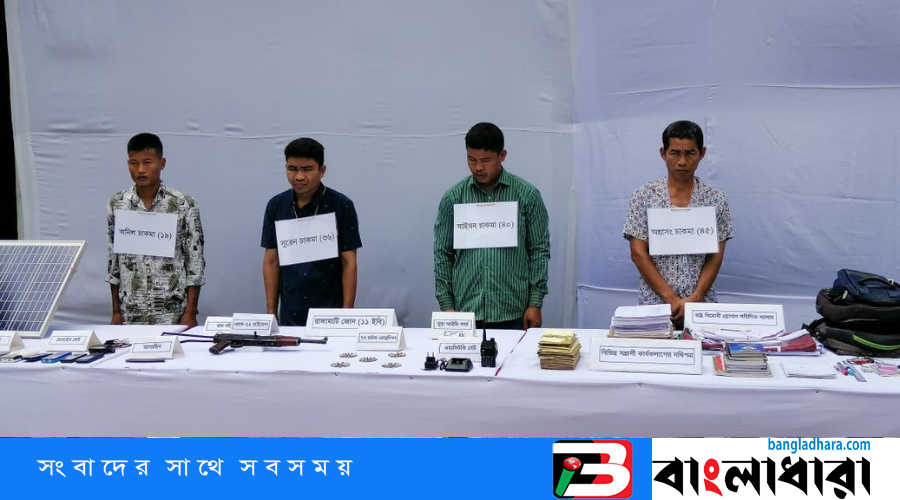 রাঙামাটির বরকলের উপজেলাধীন ছোট কাট্টলী এলাকার গভীর অরন্যে বিশেষ অভিযান চালিয়ে পার্বত্য চুক্তি বিরোধী সশস্ত্র সংগঠন ইউনাইটেড পিপলস ডেমোক্রেটিক ফ্রন্ট (ইউপিডিএফ) এর শীর্ষ চার সন্ত্রাসীকে অস্ত্রসহ আটক করেছে সেনাবাহিনী। শনিবার (৩১শে জুলাই) ভোররাতে রাঙামাটি সদর সেনাজোন কর্তৃক পরিচালিত এই বিশেষ অভিযানে ইউপিডিএফ এর সক্রিয় সন্ত্রাসী সুরেন চাকমা (৩৬), অন্নাসং চাকমা (৪৫), অনিল চাকমা (১৯) ও সাইমন চাকমা (৪০)কে একটি বিদেশী স্বয়ংক্রিয় একে-২২ রাইফেল, ৭৭ রাউন্ড তাজা গুলি, একটি ম্যাগজিন, ওয়াকিটকি, ভূয়া আইডি কার্ড, রাষ্ট্র বিরোধী শ্লোগান সম্বলিত ব্যানার, চাঁদাবাজি করে আদায় করা ৬৩ হাজার ৫৯২ টাকাসহ বিভিন্ন সরঞ্জাম উদ্ধার করা হয়েছে।