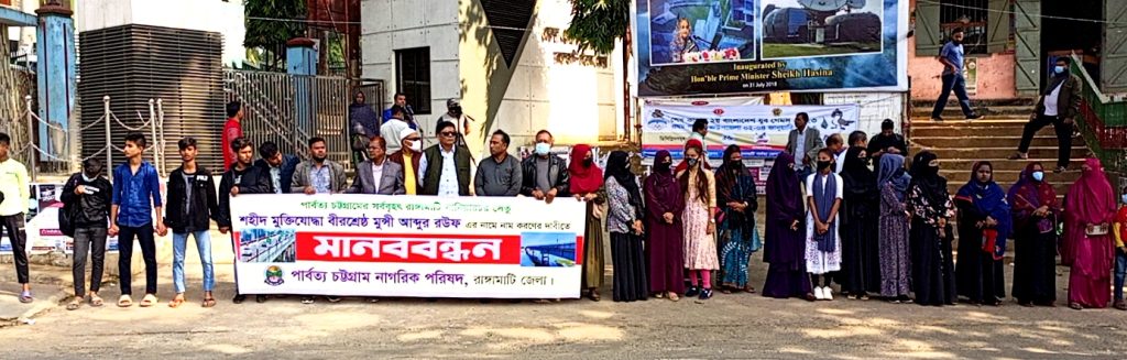 বৃহস্পতিবার (১২ জানুয়ারি) রাঙামাটি জেলা প্রশাসক কার্যলয়ের সামনে ঘণ্টাব্যাপী এই মানববন্ধন অনুষ্ঠিত হয়।