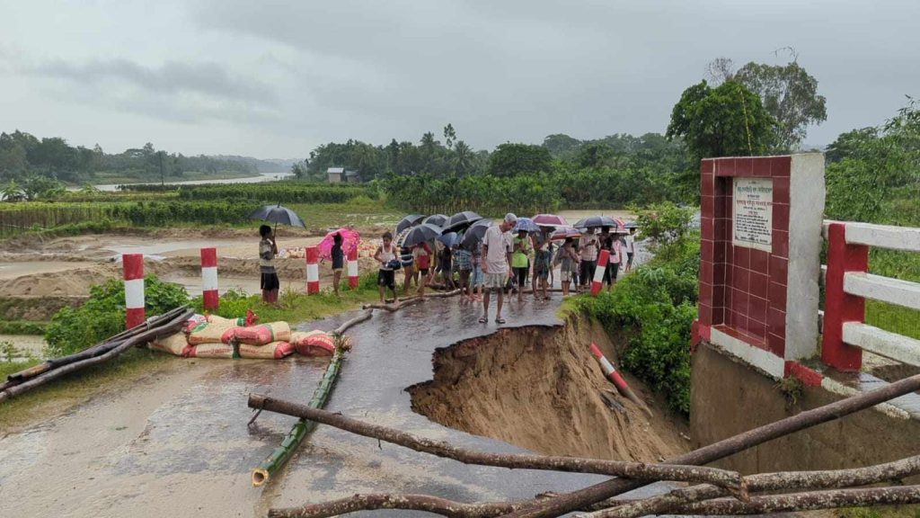 দুদিনের টানা বর্ষণের পানির তোড়ে কক্সবাজারের রামুতে সদ্য নির্মিত ‘রাজারকুল-মনিরঝিল’ সংযোগ সেতুর এ্যাপ্রোচে ভাঙন ধরেছে। বৃহস্পতিবার (১১ জুলাই) ভারী বৃষ্টি ও পাহাড়ি ঢলে স্রোতের গতি বৃদ্ধি পাওয়ায় সেতুর একপাশের এ্যাপ্রোচ সড়কের মাটি সরে গিয়ে ভাঙনের কবলে পড়ে সেতুটি। বৃষ্টি অব্যাহত থাকলে সড়কের পুরো অংশ তলিয়ে গিয়ে যেকোন সময় যোগাযোগ বিচ্ছিন্ন হওয়ার সম্ভাবনা দেখা দেয়ায় শংকায় দিনাতিপাত করছে দুপারের লোকজন।