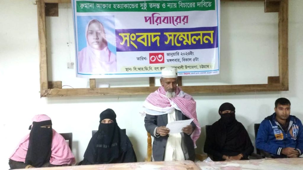 চট্টগ্রামের বোয়ালখালীতে রুমানা হত্যাকাণ্ডের সুষ্ঠু তদন্তের দাবি জানিয়ে সংবাদ সন্মেলন করেছে পরিবার।