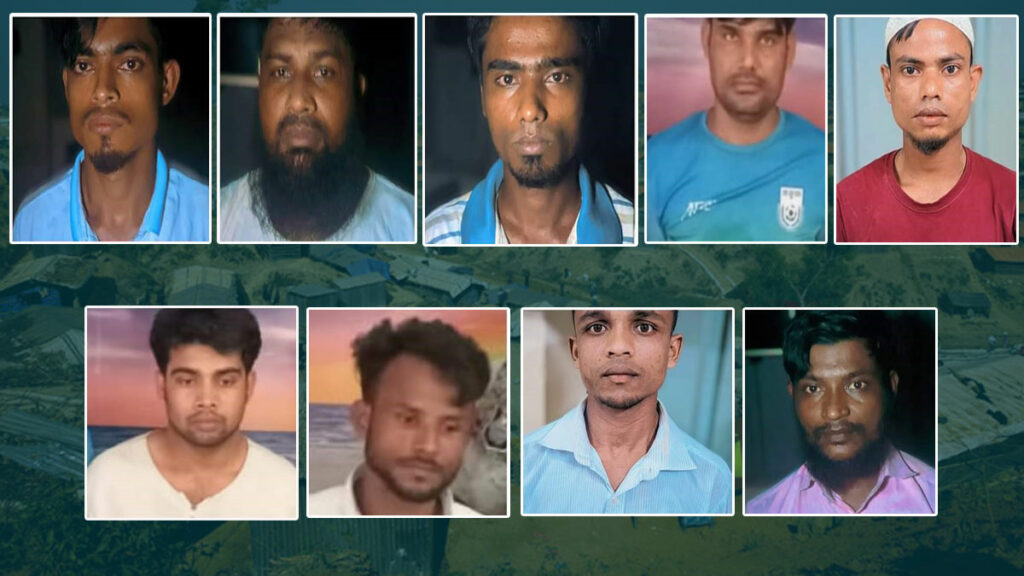 গ্রেফতারকৃতরা হলো— উখিয়ার বালুখালী রোহিঙ্গা ক্যাম্প ৮ এর বাসিন্দা নুর মোহাম্মদের পুত্র মোহাম্মদ রফিক (২৭), আমির আলীর পুত্র মোহাম্মদ রহিম (২২), ক্যাম্প-১০ এলাকার শাবত আলীর পুত্র জিয়াবুল (৩১), শামসুল আলমের পুত্র ওমর ফয়সাল (২৭), সৈয়দ হোসেনের পুত্র মোহাম্মদ ইলিয়াস (৩৮), দিল মোহাম্মদের পুত্র হাফিজ (২৯), মৃত আবুল কাদেরের পুত্র মোঃ জুবায়ের (২৬), মৃত নিজাম উদ্দিনের পুত্র মোঃ রফিক সালাম (৩১), মৃত সিদ্দিকের পুত্র মোঃ আয়াজ (৩৬)।