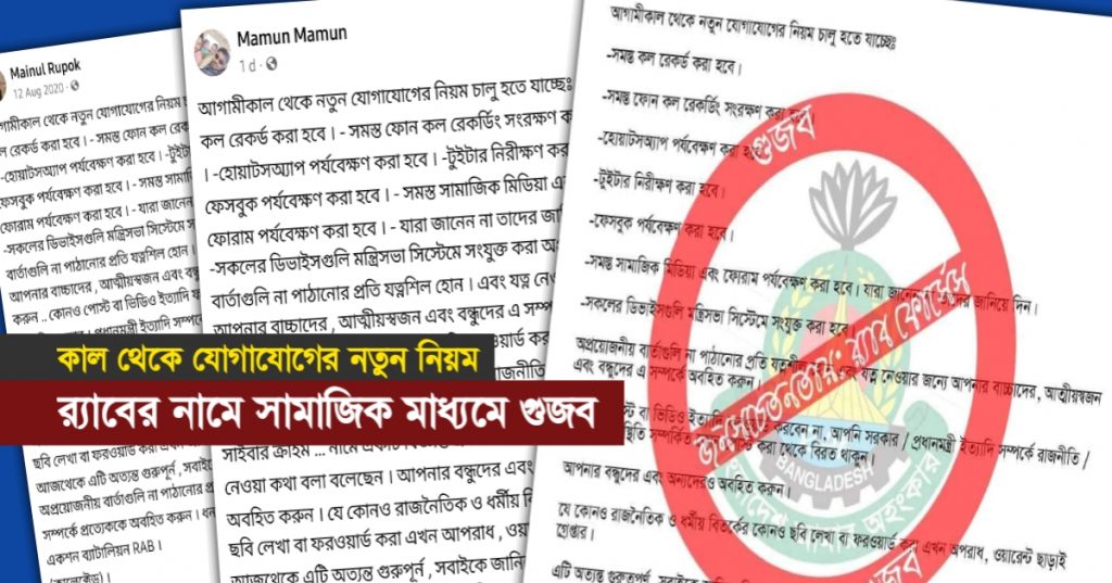 ‘আগামীকাল থেকে চালু হতে যাচ্ছে যোগাযোগের নতুন নিয়ম। সমস্ত কল রেকর্ডসহ ফোন কল রেকর্ডিং সংরক্ষণ করবে র্যাব। এছাড়াও হােয়াটসঅ্যাপ-টুইটার নিরীক্ষণ করা হবে। পর্যবেক্ষণ করা হবে ফেসবুকও।’—র্যাবের নামে দেয়া এমন তথ্য সম্বলিত একটি পোস্ট ফেসবুকে সম্প্রতি ভাইরাল হয়েছে। তবে এসব তথ্য নেহাতই গুজব বলছে এলিট ফোর্সটি।