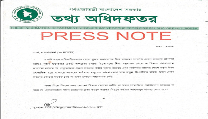 বিবরণীতে বলা হয়, ‘লবণ নিয়ে কিংবা অন্য কোনো বিষয়ে কোনো ব্যক্তি বা মহল সামাজিক যোগাযোগ মাধ্যমে বা অন্য যে কোনভাবে গুজব ছড়ানোর চেষ্টা করলে তাদের বিরুদ্ধে কঠোর আইনানুগ ব্যবস্থা নেয়া হবে।’