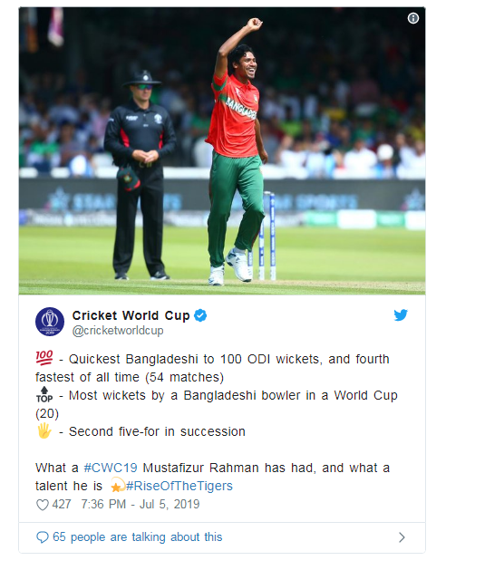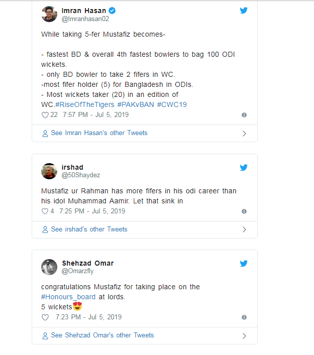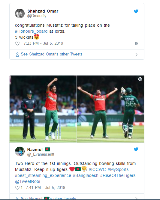 মুস্তাফিজের অগ্নিঝরা বোলিংয়ে উড়ন্ত শুরুর পরও পাকিস্তানের ইনিংস থামে ৩১৫ রানে। মুস্তাফিজের ক্ষুরধার কুড়িয়ে নেয় প্রশংসা। একনজরে দেখে নেওয়া যাক, টুইটারে মুস্তাফিজের প্রশংসাসূচক উল্লেখযোগ্য টুইট-