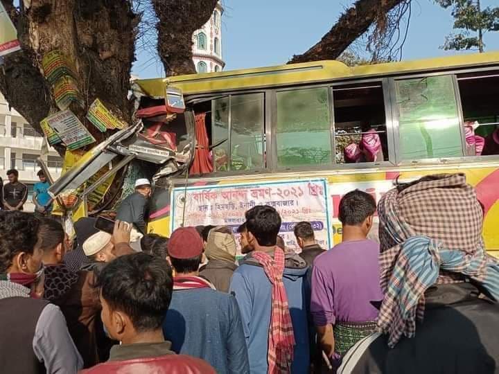 পুলিশ ও প্রত্যক্ষদর্শী সূত্রে জানা যায়, মঙ্গলবার সকাল সাড়ে ৮ টায় উপজেলার আধুনগর ইসলামিয়া মাদ্রাসা সংলগ্ন স্প্রিড ব্রেকারে নিয়ন্ত্রণ হারিয়ে কক্সবাজারমুখী একটি পিকনিকের বাস সড়কের পাশে থাকা গাছের সঙ্গে ধাক্কা লেগে সামনের অংশ দুমড়ে মুচড়ে যায়।