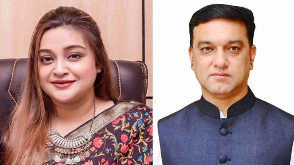 শপথ নিলেন ময়মনসিংহ ও কুমিল্লা সিটির মেয়র তাহসিন বাহার সূচনা (বায়ে) ও ইকরামুল হক টিটু।