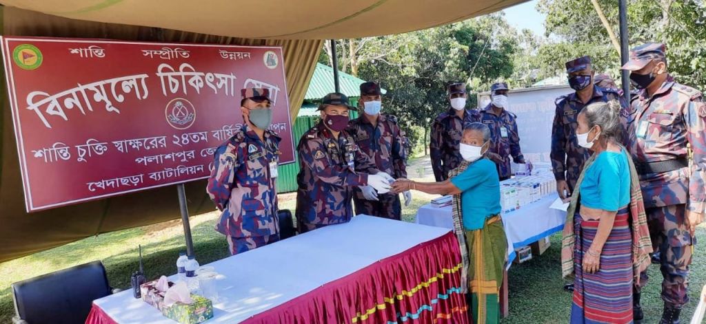 শান্তি, সম্প্রীতি ও উন্নয়নের লক্ষ্যে জোন সদর এর ব্যবস্থাপনায় ব্যাটালিয়ন এম আই রুম কর্তৃক পলাশপুর জোন সদরের সুবেদার সামছুল হক গ্রাউন্ড (বাস্কেট গ্রাউন্ড) এ স্থানীয় পাহাড়ি এবং বাঙালি জনসাধারণের মাঝে ফ্রি চিকিৎসা সেবা এবং বিনামূল্যে ওষুধ বিতরণ করা হয়।